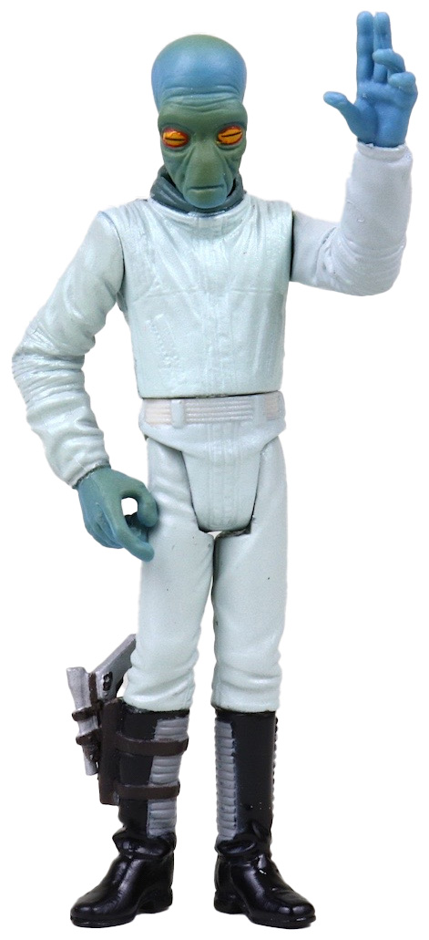 Indicative of the "collector-friendly" approach that Hasbro took during the POTJ run, here's a deep backgrounder that made it into the main line. They took the POTF2 Admiral Akbar figure of the day, did a bit of retooling, a lot of repainting, and gave him a removable helmet. In 2001, this wasn't just a "smart retool", it was a brilliant retool. It's unlikely we'll ever get an update to this guy, and that's okay, I suppose - at least given the current meager tooling environment. We rated the figure a below average 4/10, but as a deep cut backgrounder, he works well enough either milling about the Home One briefing scene, or on the bridge helping destroy the Empire. He could definitely be upgraded, even with some slight retooling of the TVC Admiral Ackbar figure, but it is what it is. I'm glad he exists.