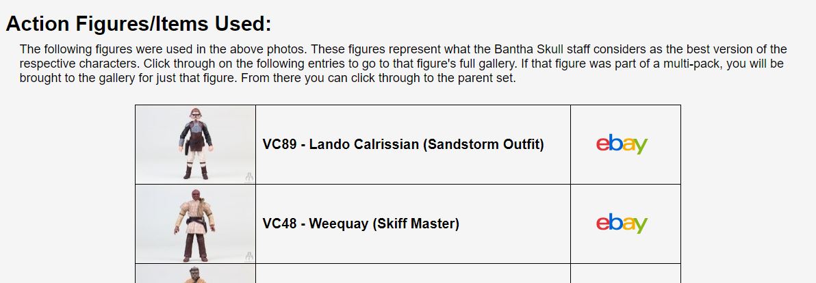 Here's where we feel the value really comes in. From those diorama photos, we will provide a list of the actual items used with links to their full galleries. If a figure or environment piece comes from a multi-pack, we will link you directly to the gallery from just that item. From there you can navigate up to the "parent set." In all cases, these will be what we consider the best figures to use for the scene. Think of this as a recipe for the diorama: