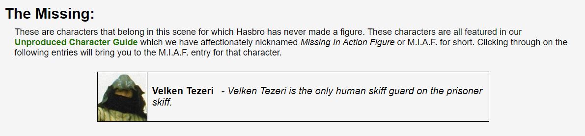If a scene is missing some key (or not so key) characters, those characters will be listed under the "Missing" banner with links to their full Unproduced Character Guide (M.I.A.F.) entry: