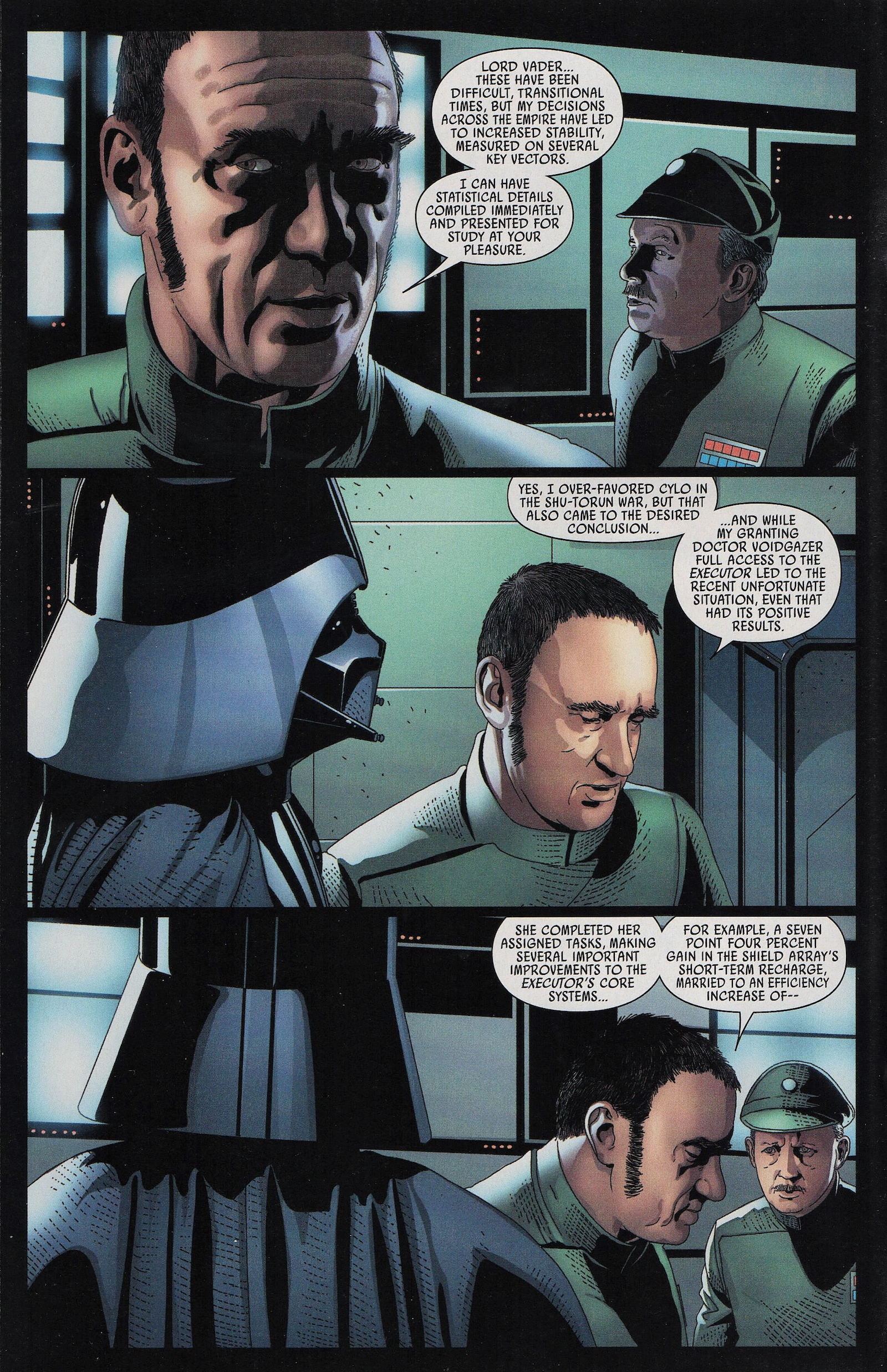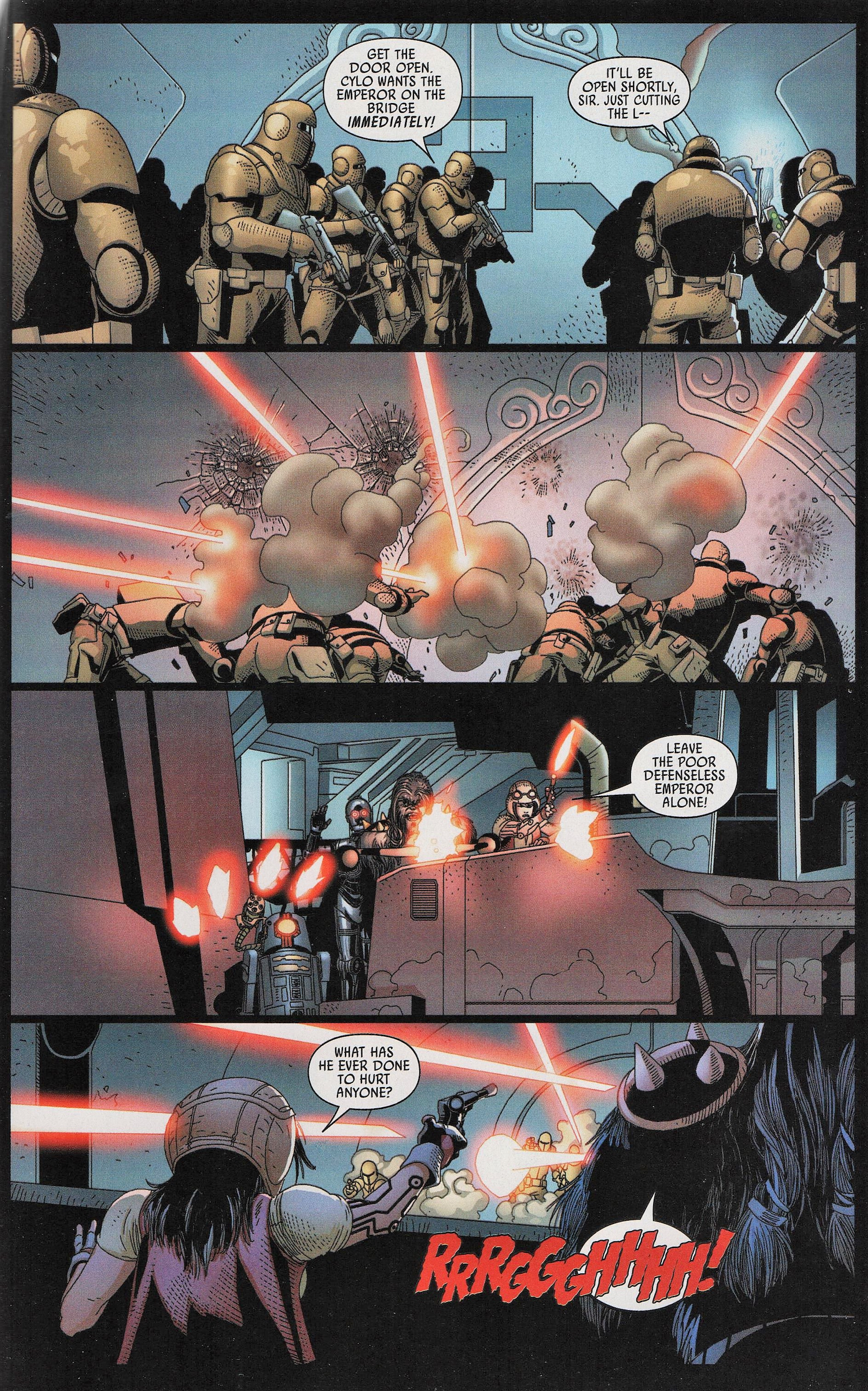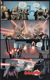 On board the Executor, Dr. Aphra is revived by Triple Zero. Tulon Voidgazer’s neurotoxin attack on the ship has left everyone but droids and aliens unconscious. Taking advantage of this, and the apparent destruction of Darth Vader, Cylo and his minions have boarded the Super Star Destroyer and are about to make a getaway. However, their escape is thwarted when they lose control of the engines; Darth Vader is alive and on board, “I am coming for you,” he tells Cylo. Morit Astarte wants to go confront the Sith, but Cylo tells him to avoid Vader by going outside the ship, get to the engine room, and restart the engines. Realizing he has precious cargo on board, Cylo sends half his men to go retrieve the Emperor and bring him to the bridge. Aphra is just about to board her ship when she hears this order go out. She knows that escaping now only delays the inevitable retribution from Darth Vader. “We’re not leaving, Master Aphra?” Triple Zero inquires. “Not yet,” she says, “I’ve had another one of my patented never-go-wrong ideas.” Morit is outside the ship on his mission to bypass Vader and fix the engines. Darth Vader, eager to do away with another would be usurper, is not to be avoided. Having anticipated this move, he is also outside the ship, waiting. Morit launches at him, he misses his mark and Vader manages to disable at least one of his rocket boots. Morit lands on an exposed girder and Vader uses the Force to break it off and send Morit plunging into the atmosphere of the planet below. So, basically, like his sister before him, he burns up. Back inside the ship, Aphra, Krrsantan, and the Killbots take out Cylo’s men as they try to breach the Emperor’s quarters. Krrsantan, by the way, makes it clear that he is only helping because Aphra owes him money. In the middle of the fight, Cylo’s guys break off and pull back. Darth Vader is nearing the bridge and he makes short work of them before finally coming face to face with Cylo. “Your machines are insufficient,” he tells Cylo. “Perhaps,” the scientist responds, “But you forget, you are one of my machines, too.” Cylo presses a button and Darth Vader stops in his tracks. Cylo tells Vader that he was unsure if his private access to his cybernetic systems had been disabled in the intervening 20 years, so he was hesitant to rely on this maneuver; but now he knows. He gloats that Vader is indeed more machine than man.