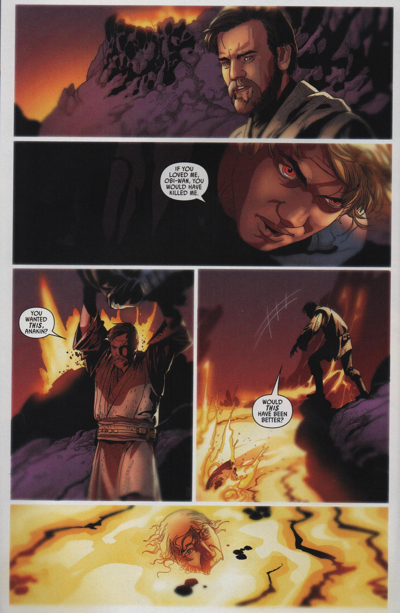 As Darth Vader is frozen and on his knees, he flashes back to that fateful encounter on Mustafar. But this isn’t merely a memory of past events. This time a maimed Anakin shouts to Obi-Wan, “If you loved me, Obi-Wan, you would have killed me.” “Would this have been better?” Kenobi shouts as he picks his friend up and throws him into the river of lava. From the river arises the familiar form of Darth Vader. He strikes his former master down just as the other man disappears in the same way that he had on the Death Star. Vader then encounters Anakin Skywalker, as he appeared just before his fall. Their lightsabers clash, and Vader inflicts the same injuries on him that Obi-Wan did. “How could you do this?” asks young Skywalker. “You were a child,” Vader replies as he drags Anakin toward the lava, “I am well accustomed to killing children.” The Sith walks away to the familiar shout of “I hate you.” A different voice now: “Turn back, Ani; stay with me,” from a very obviously pregnant Padme. “You don’t need to go on. It can be over. You know you don’t want to leave.” “No,” is his only response. We see Padme begin to choke and slowly fade away. “Anakin is dead,” Vader says, “I killed him.” Vader struggles to break free of chains binding him to the operating table where he was re-born. At the same time, Cylo witnesses his nemesis moving, standing, and calling his lightsaber to him; “Impossible!” he exclaims just before Vader impales him. “Nothing is impossible for the Force,” is Darth Vader’s response. Out in space, in what remains of Cylo’s whale fleet, Cylo-VI, the next clone to embody the scientist’s personality awakens. He knows that his predecessor is dead, and that he must escape. Vader tells the Emperor that the Executor is freed from Cylo’s control and that he is on the way to deal with one final problem (Cylo-VI). Then, Aphra appears in the Emperor’s quarters; “I’ve got things you need to know.”