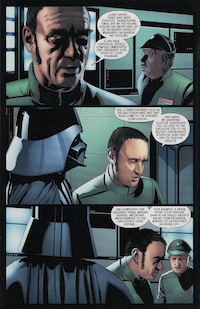 Vader, in his TIE fighter, makes his way on board the whale ship wherein Cylo-VI is attempting to escape. He mows down a bunch of guards, then gets to the lab where he takes pleasure in killing a bunch of “in case we run out” Cylo clones. Vader finally comes to the bridge, where Cylo-VI has learned nothing from what just happened to Cylo-V: “I transcended the laws of nature and the trap of the Force. I made myself immortal.” Darth Vader makes a familiar gesture with his hand, “I will make you ash...you will fly into the sun.” Cylo thinks he was talking to him, but he wasn’t. We see the space whale’s brain become active. As Vader departs, the whale plunges itself into the sun. Darth Vader returns to the Executor, and in the Emperor's throne room he finds that Aphra has gotten to Palpatine first and told him (nearly) everything they’ve been up to. Sheev lists his apprentice’s transgressions: creating an Empire within the Empire, robbing Imperial treasuries, killing all who might expose him. Aphra thinks she has the upper hand now, that Vader will surely face retribution from his master. Palpatine, however, is most pleased with Vader’s performance. He let his anger and pride guide him to the darkest places. That is the way of the Sith. He has proven himself a most worthy apprentice. The Emperor turns Aphra over to Vader and departs for the bridge. Aphra tries to explain to Vader that this was really her only option, she says she didn’t betray his real secret about “whatever’s going on with that Rebel kid,” and anyway didn’t everything work out okay in the end? Remember back when they first met and Aphra basically said to Vader, “look, I know you’re probably going to end up killing me at some point, just don’t do it by flushing me out the airlock”? Well, he flushes her out the airlock. Not to worry, this is not the end of Dr. Aphra. Krrsantan and the Killbots are standing by to rescue her using the same trick they did when they robbed the Imperial ship of the credits. This was all part of the not so good doctor’s plan: the only way Vader was going to get off her back was if he thought she was dead; and she knew he would never be kind enough to just kill her with the lightsaber. Back on the Executor: Grand General Tagge now finds himself demoted by the Emperor and placed under the authority of Darth Vader as a result of his recent failings. The Executor is now Vader’s ship. Tagge tries to smooth things over and is Force choked by Vader. So, he’s dead now for real. Vader tells Adm. Ozzel to have the ship ready in 2 weeks. He tries to protest, but is quickly reminded of the dead guy two feet away. Ozzel learns his lesson and I’m sure he will have no further problems with Darth Vader. As Vader looks out the window of the Executor, he has a vision of himself reaching out to Luke Skywalker, and Luke reaching out to him. “Soon,” he says.