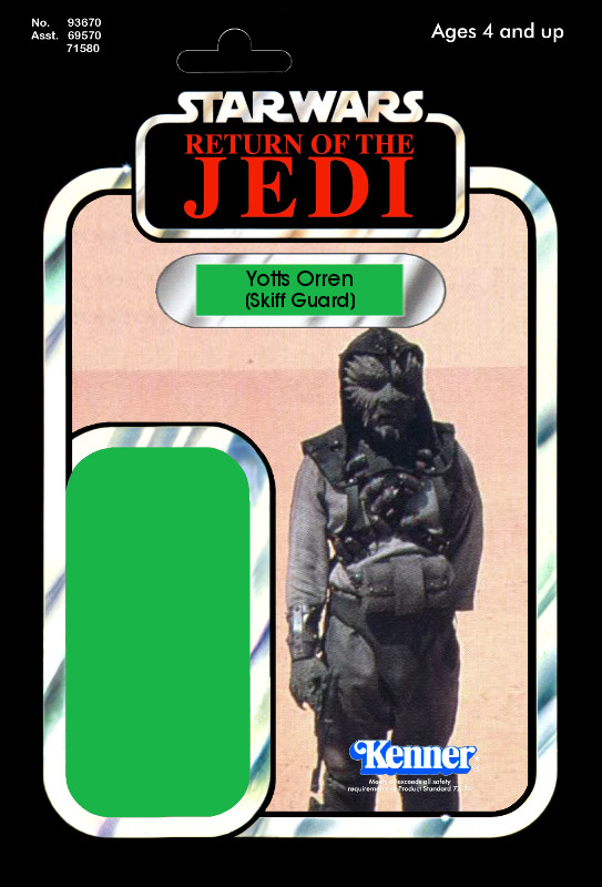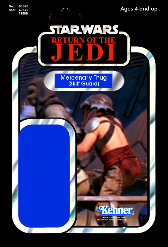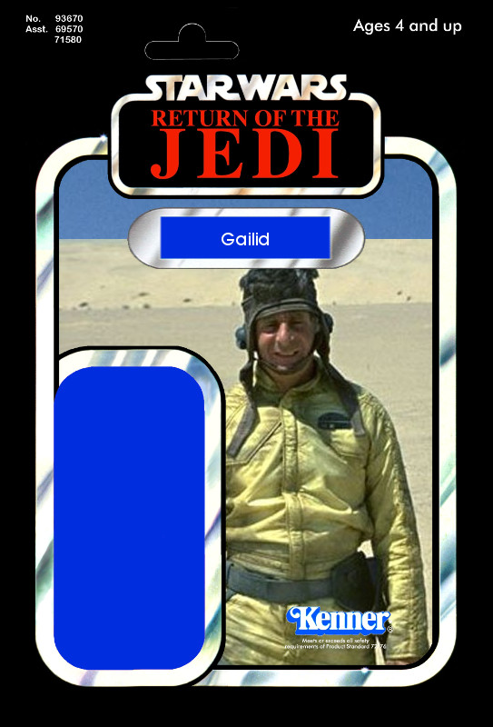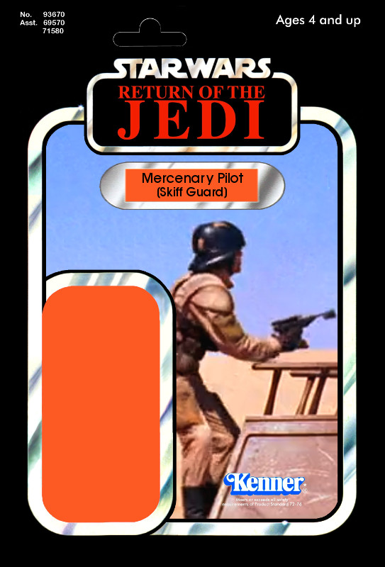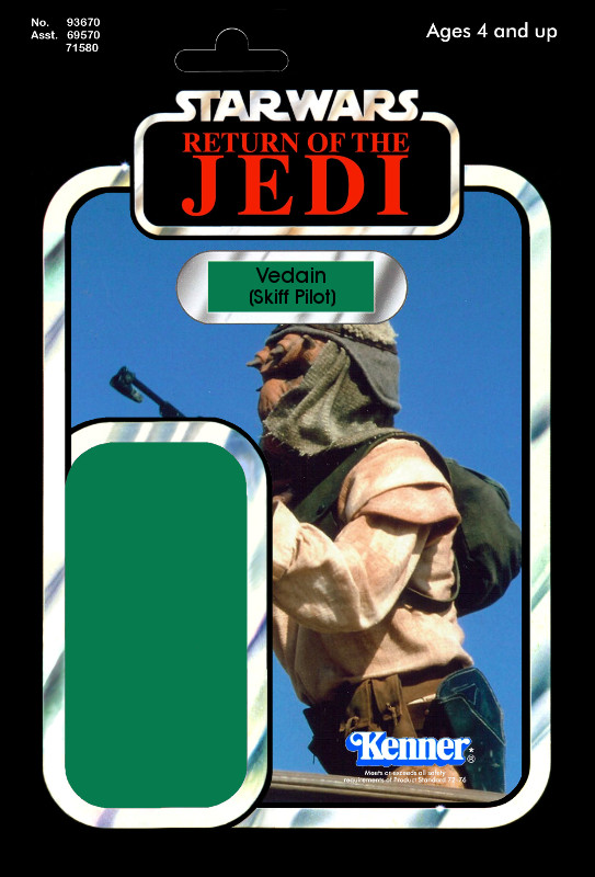 Two characters are as yet unmade for the prisoner skiff. Of some importance is Vedain. Already a priority for us because he's the actual driver of the prisoner Skiff, a realized Khetanna would rocket this guy into the "Must Be Made" status. This Nikto is one of the more prominent backgrounders in the Battle of the Pit of Carkoon. In fact, regardless of the outcome of the Khetanna campaign, Vedain should be towards the higher end of Hasbro's TVC priority list. Get 'er done, Hasbro. As for Velken Tezeri, he's a human background character, but if we get Vedain as we should, then Velken would be the last figure needed for the Prisoner Skiff. If Hasbro makes Vedain, then Velken has to follow. This is science!