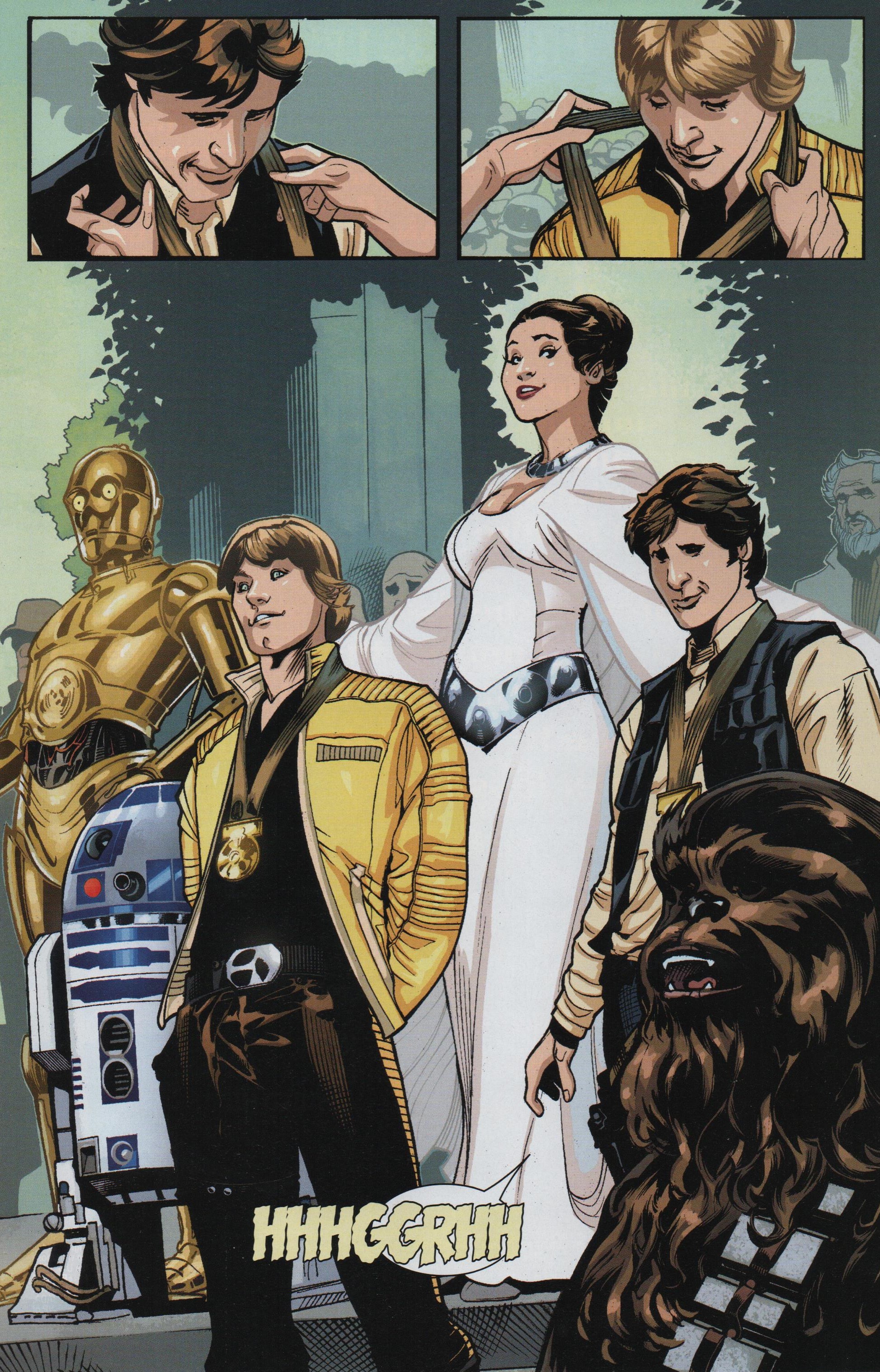 Our story opens at the tail end of the medal ceremony following the destruction of the Death Star. Princess Leia makes a quick speech memorializing the Rebel losses in the battle as well as the obliteration of Alderaan. In fact, the speech may be a little too quick as a couple of people in the audience remark on Leia’s apparent coldness. I wonder what they would think of her snubbing Chewbacca after Han died? Anyway, Dodonna steps up and tells everyone to get in gear and commence evacuation of the base. Following the ceremony, Leia seeks out Dodonna to find out what her next mission for the Alliance will be. He tells her she isn’t getting out of his sight because the Empire is seeking out surviving Alderaanians for reprisals and has a 10,000,000 credit bounty on her head. Making her way through the base, Leia comes upon Evaan Verlaine, an Alderaanian pilot who survived the attack on the Death Star in her Y-Wing. Evaan is at first deferential to her princess, but when pressed by Leia reveals her anger at Leia’s coldness and reserved reaction to the loss of their home. Evaan was mentored by Queen Breha and is loyal to the throne; she explains that showing Leia respect, even if she doesn’t like her, is her way of preserving what little of Alderaan is left. Evaan tells Leia that it’s not just some, but all Alderaanians, that the Empire is hunting down. That’s when Leia realizes what her next mission is. She sends Gen. Dodonna a holo explaining that it is her sacred duty to gather and protect every last surviving son and daughter of Alderaan. At the same time, she, Evaan, and R2 are making their escape from Yavin. Luke and Wedge are dispatched to stop them, but a cunning ruse (a clever attempt to trick them) by Evaan allows them to slip away into hyperspace. Their first stop: Naboo.