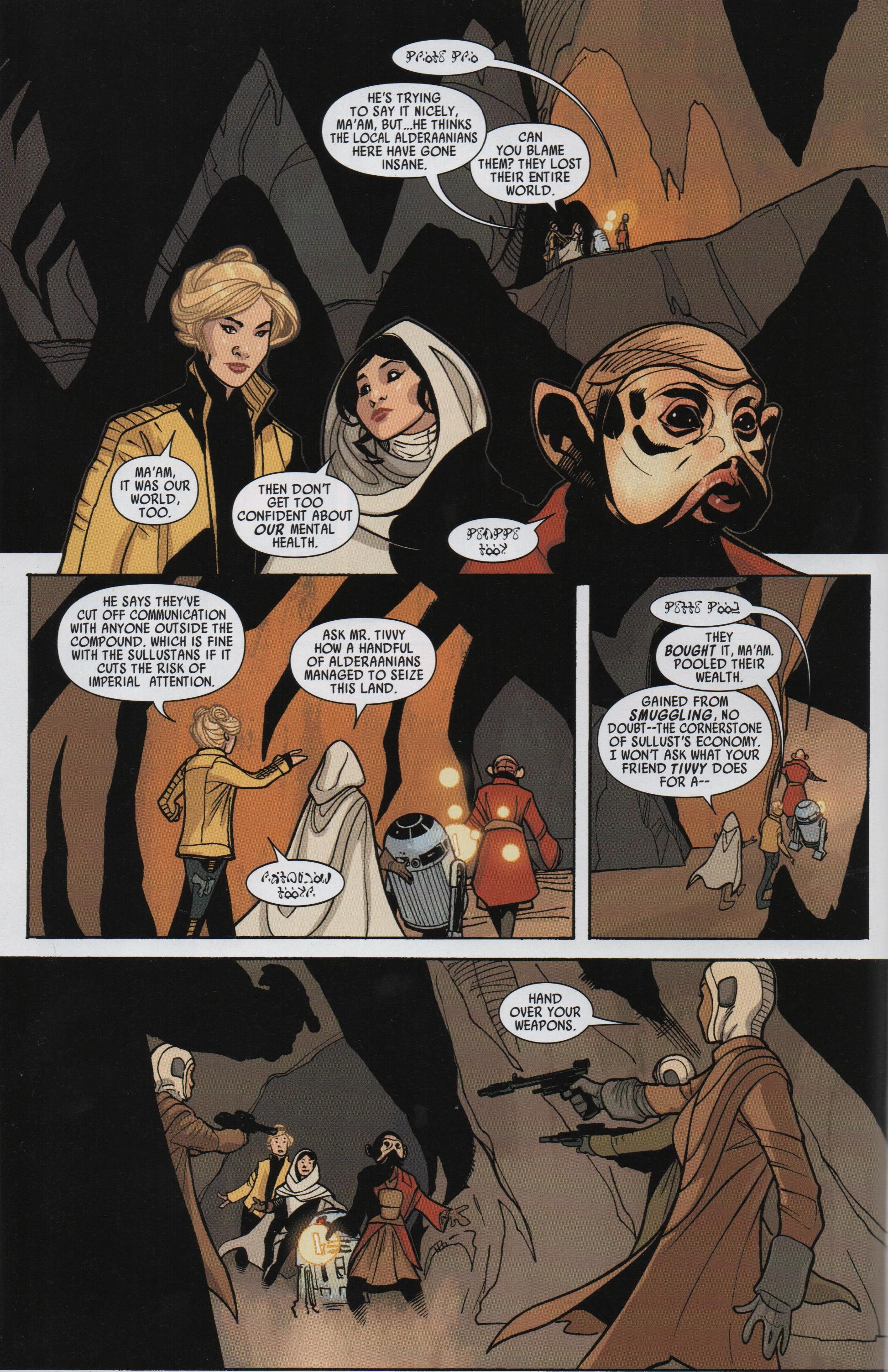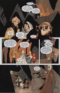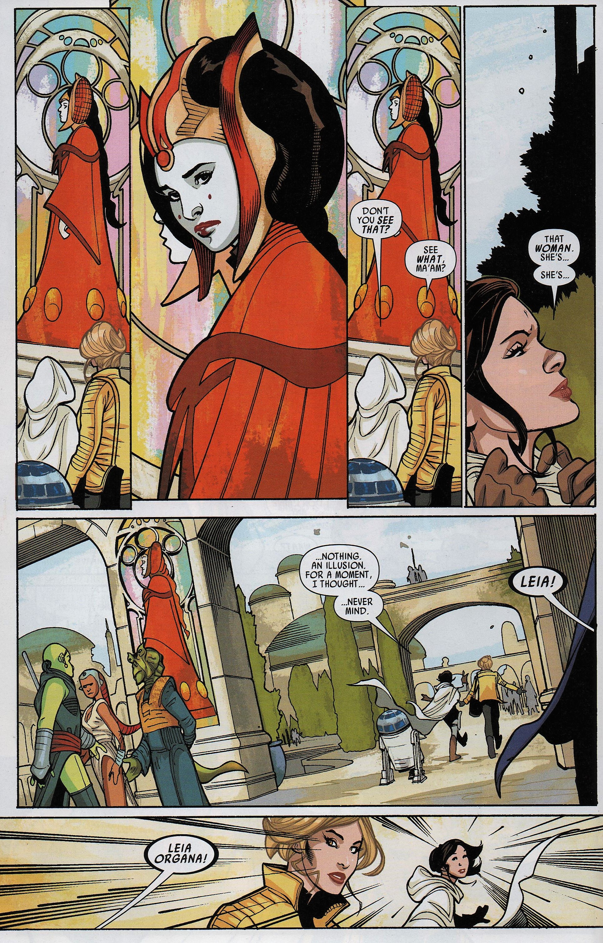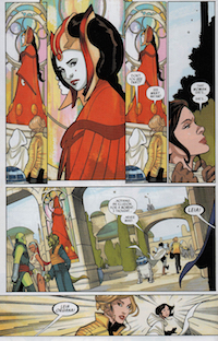 In the ship, en route to Naboo, Leia recalls a lesson taught to her by her father. In particular she remembers him telling her that, as Queen, it will be her responsibility to protect the people and traditions of Alderaan; to keep their culture focused on creativity, love, and life. “I’m sorry father...for failing you”, a downcast Leia says as she sits alone. As they arrive on Naboo, Leia tells Evaan that there is an Alderaanian cloister on the planet; little known but long standing. It’s actually a group of musicians who only perform via holo. The keep themselves sequestered in order to avoid polluting their music with outside influences. While Leia is entering Theed from the spaceport, she sees a large profile picture of Queen Amidala. She is captivated by it, and for an instant it seems to turn and look at her. She shakes it off as an illusion and keeps going. They meet with Lord Junn, an old acquaintance of Leia and her father. He tells them that the melodic order can be found working for a club owner in the city of Keren. He tells Leia to use his name to get in and get them, the club owner is in deep debt to him. Meanwhile at the club in Keren, Madame Pareece, a fellow Alderaanian who acts as go between for the musicians and the club owner, is approached by Tace, one of the musicians. She wants to send a message to Alderaan to check on her sister, she senses something is wrong. It turns out Pareece has not told the performers about the destruction of their planet; she has been pressured by the club owner to keep it from them in order to keep them performing. Leia and Evaan arrive and the club owner grudgingly agrees to turn them over to her (she is impersonating an Imperial minister); however, one of his Besalisk bouncers slips up and calls her princess. They know who she is! A fight ensues and although they take out the three Besalisks, the club owner is about to get off a shot when he is felled from behind. It was Madame Pareece. She recognized Leia when she arrived and now sees her chance to make things right. Leia addresses the cloister, telling them that their creativity will keep their planet alive. She invites them to come with her, and reclaim every last orphan of Alderaan. Leia then returns to Lord Junn’s palace and confronts him at blaster point. She knows he betrayed her. In exchange for his life, Leia asks for and receives a ship, capable of carrying at least 20 in comfort. Both ships set course for Sullust. On board their new ship, Tace is able to contact her sister. She tells her that she must mourn with her in person, and that she is leaving the order. Her sister objects. Tace must stay with the princess; but her sister insists that she stay in contact, tell her where she is going and what she is doing. In the final panel of the issue, we see that Tace’s sister is an Imperial officer.