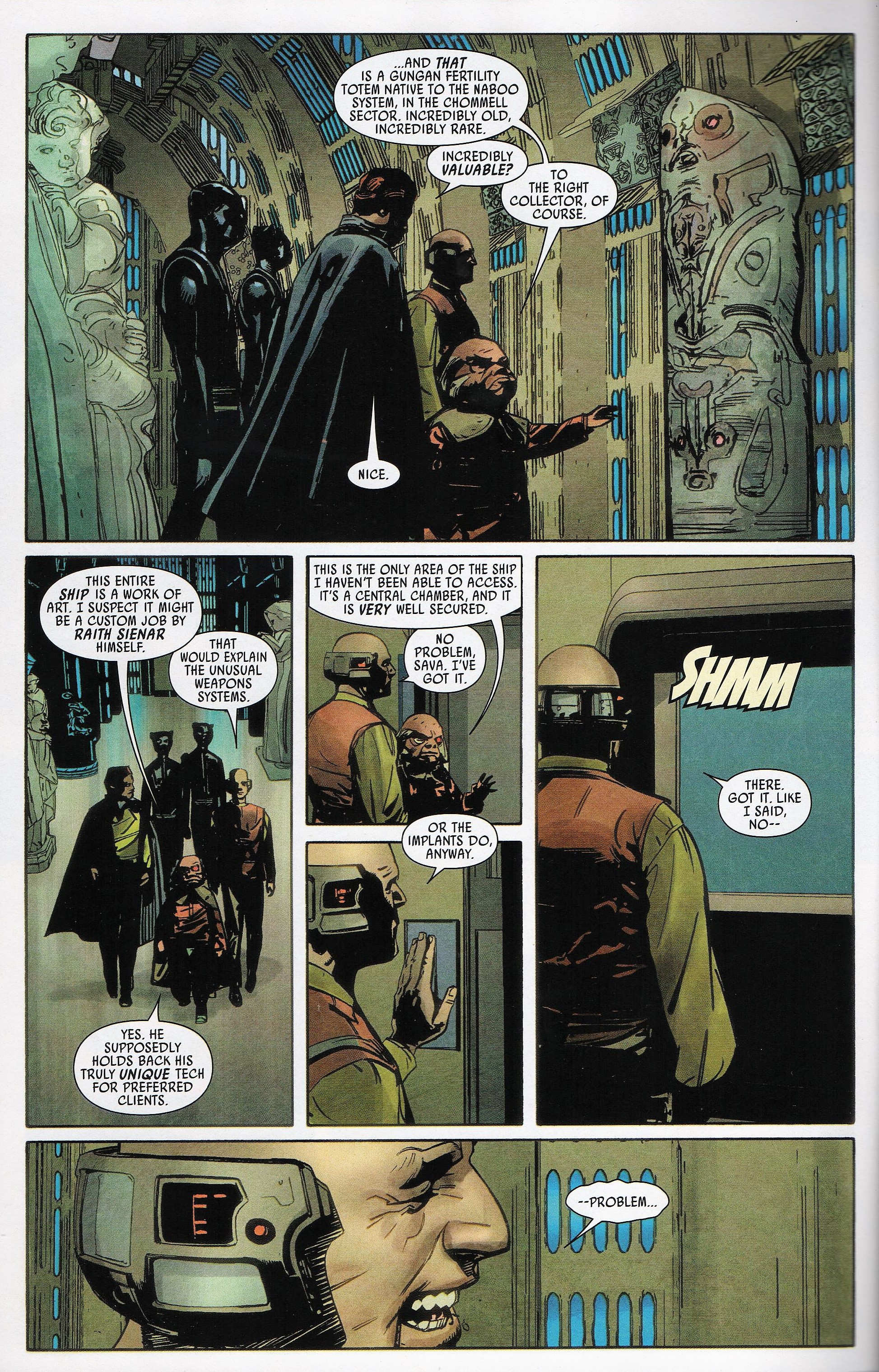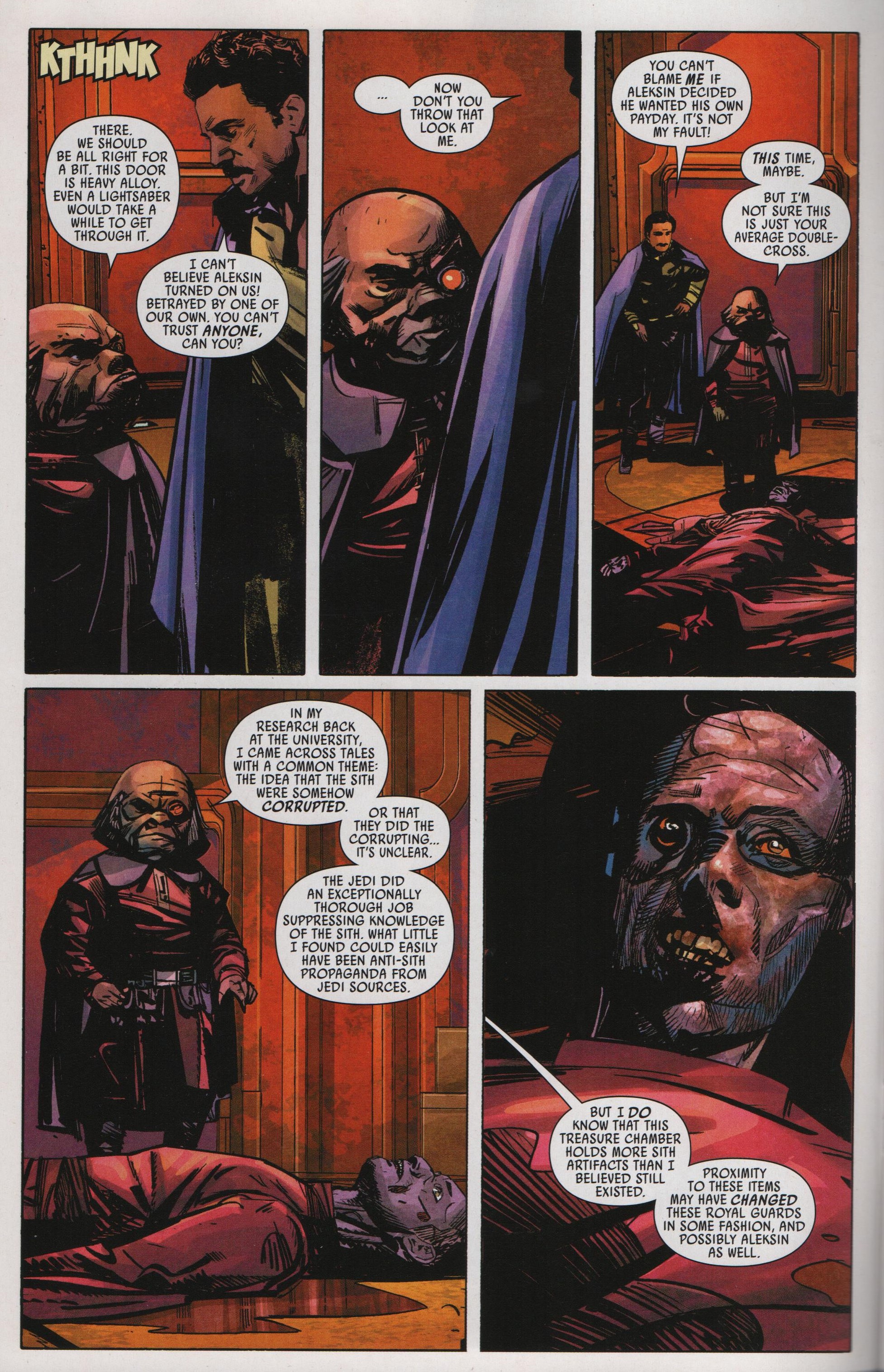 Learning of the theft of his yacht and its priceless treasures, the Emperor dispatches favored bounty hunter Chanath Cha to either kill the thieves and recapture the ship, or failing that, destroy it. Back on the Imperialis, Lobot is in a bacta tank, attempting to keep his implants from taking advantage of his weakened state to completely take over his mind. Aleksin and Pavol become corrupted by a Sith helmet and start fighting with each other. Lando and Korin vacate the chamber at about the same time Chanath arrives in the Scimitar, the ship that once belonged to Darth Maul. Once on board, Chanath discovers that Lando is the one behind the theft. Fortunately for him, they go way back; and not in the sense that she’s been wanting to kill him for a long time. She agrees to destroy the ship and let them escape; however, their departure is complicated by the two man-sized cat people trying to kill them, and by the fact that the caretaker droid on the Scimitar took off without them because, like all droids, he’s a jerk. Anyway, one dead Ugnaught and two dead cats later, they escape, but only after Lobot allows the implants to take over so he can get the escape pods back online.