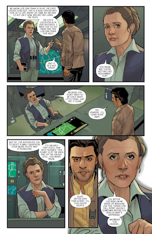 In a just world we would have gotten a comic series set immediately after ROTJ; or one set several years before TFA, showing Leia building up the Resistance and further exploring the workings of the First Order and Kylo Ren’s descent into darkness. Instead, we get this; a series focusing on Poe Dameron, taking place about a year before TFA. However, if one accepts the limited scope; and assuming one has an at least mildly favorable view of the Sequel Trilogy, I think there is a lot of enjoyment to be found here. Poe Dameron comes across as one of the more charismatic and likable characters of The Force Awakens. He’s confident, cool, and friendly. All of that comes through pretty clearly in the comic. We are also introduced to our main antagonist for the series, Terex. I like Terex. He is a delight. He works for the First Order, holding a position in their hierarchy; however he is clearly not a “company man”. He seems to be taking up this work for his own gratification, as well as wanting to see the First Order rise to the legend of the Empire that he used to serve. In all honesty, if you are reading this series for the first time, Terex is the character to watch. He’s not another cookie cutter villain, and he brings a sense of humor into the mix.