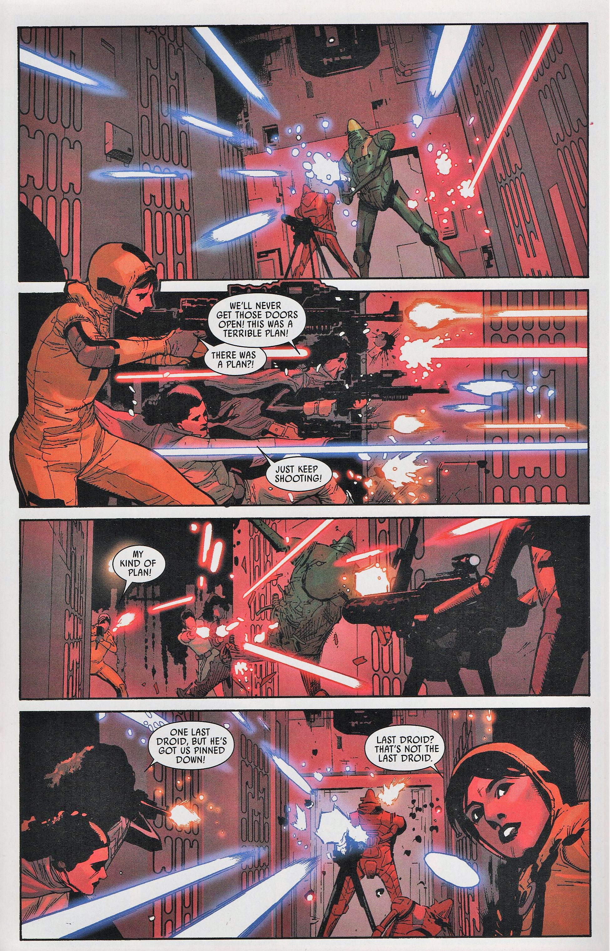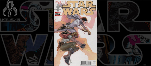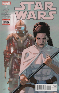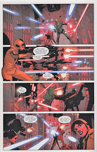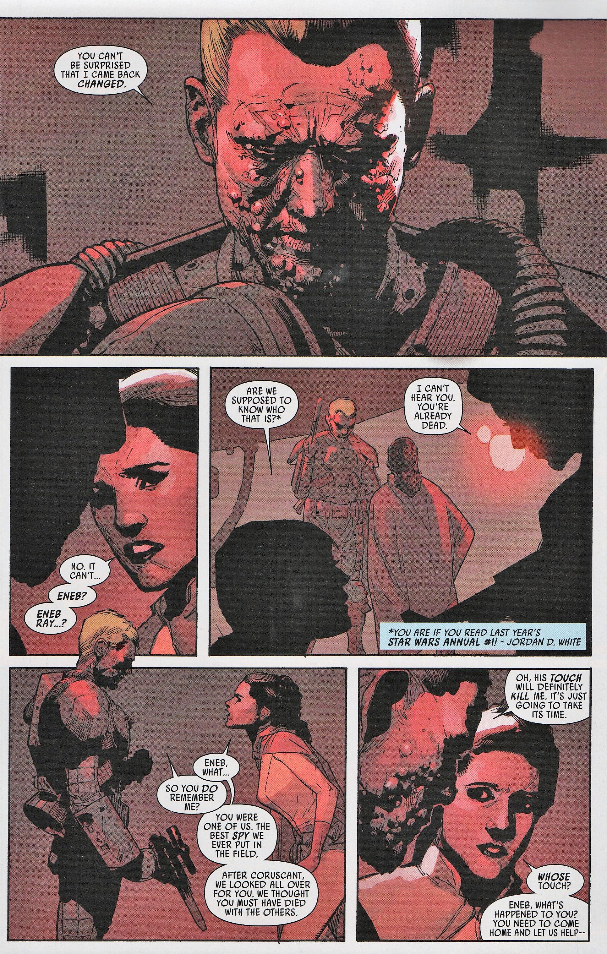 Leia, Sana, and Aphra rush to the docking bay only to find that Baddy McBadface has incapacitated Luke and Han and hung necklaces of thermal detonators around their necks like he is planning the world’s worst luau, or the world’s best luau. He tells Leia once again that it’s time to start taking this war seriously; which is to say, start killing more people. Apparently, this guy doesn’t realize that one of the people he’s captured murdered a population the size of a small moon (that was no moon) like 3 weeks before. He tells her, “you have an Imperial prisoner in your midst; shoot her and I’ll let your friends go”. Leia refuses, much to the chagrin of Sana who is totally ready to pop a space-cap in the not so good Doctor. At this point our mystery villain finally chooses to reveal himself. It’s Eneb Ray! The guy from the Annual. “You sent me to them”, he tells her, “you can’t be surprised that I came back changed”. Eneb starts a countdown and just before he presses the button to kill the guys (and everyone else in the room I would think), Leia gives R2 the order to send out an ion pulse. It disables the weapons, as well as the artificial gravity. Leia and Ray are float fighting, and Sana decides that now is as good a time as any to beat the crap out of Aphra for whatever she did to her. I mean, really, what happened between these two? Did Aphra say she was going to move in with her and split the rent, and then left Sana holding the bag on a lease for an expensive Coruscant apartment? Did she forget to pick her up at the airport once?