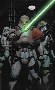Anyway, when Aphra apologizes and admits she is better at dealing with machines than people, Sana tosses her at Eneb Ray and ends both fights. So, power is eventually restored to the prison and the warden is let out of whatever broom closet he was stuck in. He remarks to Leia that, in the clean up, one prisoner seems to have been misplaced. Next, we see Leia stop Dr. Aphra from sneaking into an escape pod. She tells her that she can’t just let her walk away and also gives her a warning about continuing to pal around the Darth Vader. “...he will get around to killing you," she says. Leia suggests that if Aphra should survive her time with Vader she should look her up. Aphra is confused. Leia said she wouldn’t let her walk away. “I didn’t say anything about her," Leia says as Sana kicks the doc onto the pod and hits the button. So, they let her go; but they also mention that they placed trackers all over her. Back at the Falcon, Han and Luke decide that this wasn’t their best rescue and also agree not to mention the whole nerf herding thing. We see Eneb Ray, now in binders and a prisoner himself, tell Princess Leia that someday she will regret not listening to him. In an epilogue taking place days later, we see a team of special ops stormtroopers arrive at a now abandoned Sunspot prison looking for a captured comrade named Kolar Ludd (he appeared in issue 17 as one of the prisoners Leia subdued). The leader of the troops is seen brandishing a green bladed lightsaber.