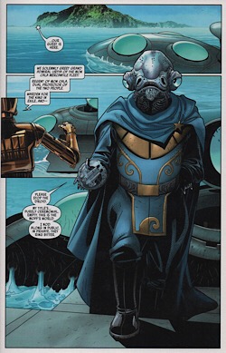 At the same time that this story was being published, the Darth Vader comic (the second series written by Charles Soule) was doing a story called Burning Seas. It depicts a revolt on Mon Cala that takes place a few years into the Emperor’s reign and shows how Lee-Char came to exiled and imprisoned. It was not an official crossover, but the two stories complement each other quite well. Lee-Char first appeared in the Clone Wars episode “Water War”.