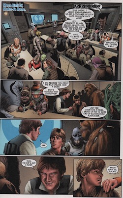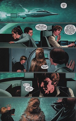 Even though I enjoyed this story, and as genuinely good as it is, I need to complain about the art. Salvador Larroca is a solid comic book artist (as far as his SW stuff, I know nothing of his other work). What I mean by that is that while his work is not particularly daring or innovative it easily accomplishes what it needs to as funny book pictures: it brings the script to life visually, it is clear in conveying the action on the page, the layouts/panel placements are coherent, and it succeeds as sequential art. Almost never have I been reading a book drawn by Larroca and thought “huh, wtf am I looking at?” The problem here is one that I have discussed before, and that other reviews on his work have mentioned. I don’t bring it up every time, but sometimes I feel the need to revisit it because it is a continuing problem. Many times, but not every time, when drawing the face of a character (usually one of the main cast or another human character) Larroca will take a still image from a film and photo reference it onto the page. This is compounded by the fact that the colorist will then give it a much more photorealistic finish than the surrounding art. It’s distracting and it takes you out of the story. You look at Han and you see him with the exact same expression that he has in a scene from The Empire Strikes Back and all of a sudden that’s what you’re thinking about and not the story you’re reading. The rest of the page can look like normally drawn, normally colored comic art and then there’s the sore thumb sticking out. Remember that episode of South Park where Mr. Garrison gets a nose job? Of course you do. He comes out of Tom’s Rhinoplasty and in place of his normally animated face it’s a real picture of David Hasselhoff? It was hilarious, and I love it; but I shouldn’t be thinking about it every time I read a Star Wars comic.