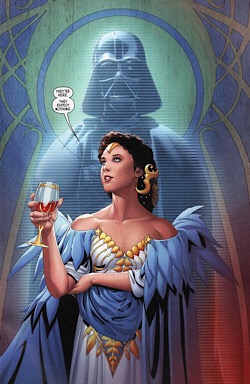 Meanwhile, 3PO, R2, and Tunga must make a hasty exit from the Mon Cala opera when their ruse (their clever attempt to trick someone) is discovered. Returning to Mon Cala, Leia and the gang are confronted by Urtya and he confiscates the recording. Thinking their mission a failure, they sulk back to the Falcon and head off planet; but Urtya has a patented Star Wars change of heart and does indeed broadcast the king’s message to the fleet. Emboldened by Lee-Char’s message and his sacrifice, they overthrow their Imperial overseers. As they attempt to escape orbit, an Imperial fleet arrives to blockade them. Fortunately, Ackbar and a Rebel Squadron arrive to help. The escape is made with the loss of but one Mon Cal ship. Months later, after the fleet has been outfitted with weapons and is about to have its launch party, Leia thanks Trios for her invaluable help. All is not well, however, as we see Trios contact Vader once she is alone.