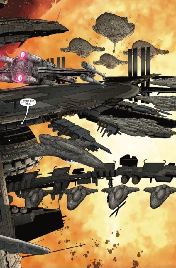 Kieron Gillen strikes hard with Hope Dies. Although it’s his third storyline since taking over the writing of Star Wars it feels like his whole run leading up to this has been one big story, culminating in a (literally) explosive denouement. This is a climax, not only for Gillen’s run (thus far), but also much of the groundwork that was laid by Jason Aaron in the first 37 issues. This series started nearly four years and 50-something issues ago with the Rebels still basking in the glow of their Death Star victory, flush with hope that their fight against the evil Empire was winnable. A series of smaller victories seemed to confirm this, but Aaron ended his run with a clear message that the Empire still had teeth. Gillen picked it up and added the false hope and sting of betrayal by bringing in Queen Trios from his celebrated Darth Vader series. In that series, Trios was presented as an interesting contrast to the other lady in Vader’s life, Doctor Aphra. Here, Trios is set against Princess Leia, another character for whom she is a fascinating contrast. Princess Leia fearlessly stood up to the Empire. The result was the complete destruction of her planet. Queen Trios was given a reminder of Alderaan when Vader first visited her home. Then and there she decided she would do whatever she had to do to protect Shu-Torun from that fate. For her, that doesn’t mean standing up to the Empire; it means making herself a collaborator of the Empire. Having her ingratiate herself to Leia, then betray her, making the two of them personal enemies, nemeses if you will, was a brilliant idea. I am very interested to see how this relationship plays out. Will it end in Trios’s redemption, her destruction, or both? Trios is certainly not a hero, but she’s not exactly a villain either. Even given her actions in this story, we still see her as a tragic figure. She is someone motivated by the kind of oppressive, unrelenting fear that has always allowed organizations like the Empire to thrive.
