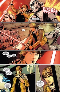 A very generous use of supporting characters really gives this story a feel that ties it into the movies. We see familiar Rebel high command faces from A New Hope and Rogue One, and also get a reasonable explanation for why none of them (except Mon Mothma) re-appear in The Empire Strikes Back or Return of the Jedi. I was very pleased to see Gen. Draven get something of a rehabilitation in this arc. Let’s be honest, he comes off as a bit of a jerk in Rogue One; here he retains his hard edge and no-nonsense attitude but also acknowledges his past mistake and shows he’s an officer who can fight just as well as he can give orders. You should already know what to expect from Salvador Larroca’s art. He actually seems to be doing better with the face thing here. My opinion of Larroca’s Star Wars work has fluctuated a bit over the course of Darth Vader and his work on this series. I still think he is a good comic book artist, but his strong suits are drawings of non-humans and tech type stuff. When it comes to drawing people, the close up stuff is usually good; but wide shots of groups of people, especially people in motion, tend to look kind of static and awkward. That said, his work here passes the basic test of coherently presenting the action of the story.