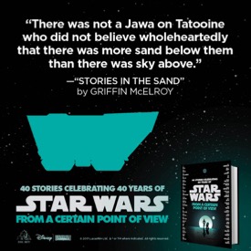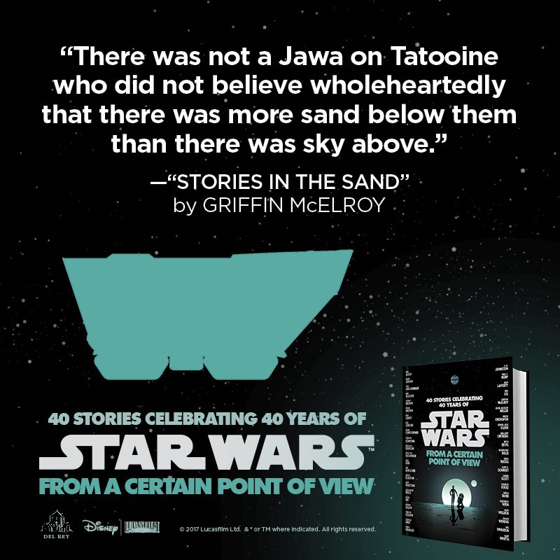 "Stories in the Sand", by Griffin McElroy, puts us under the hood of a tiny jawa on a sandcrawler. Jot's duties on the sandcrawler are to collect and clean parts scavenged from the sands which pass by his station on a conveyor. Jot has a bit of an individualist streak, and spends time cultivating his own personal collection of valuables, which he hides in an impossibly small compartment he discovered under the conveyor. Over the course of his "tour" on the sandcrawler, Jot discovers items that unlock a larger world beyond the sands of Tatooine. One day, he discovered something that changed his life. McElroy gives us a neat glimpse into life inside a sandcrawler.