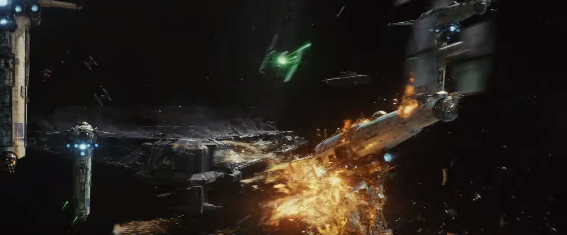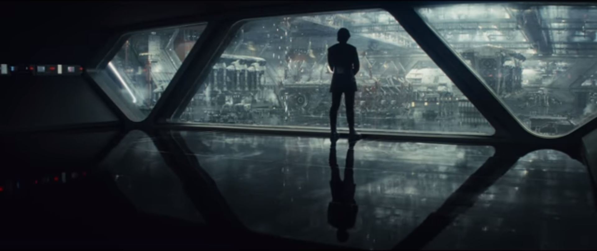 In the opening shot, Kylo overlooks a hangar presumably of the First Order Dreadnaught. Snoke is providing voice over talking about a powerful Force adept. This is probably trailer misdirection to get the audience to think he's talking about Kylo, but he's likely talking about Rey. All thumbnails are clickable for the full sized image.