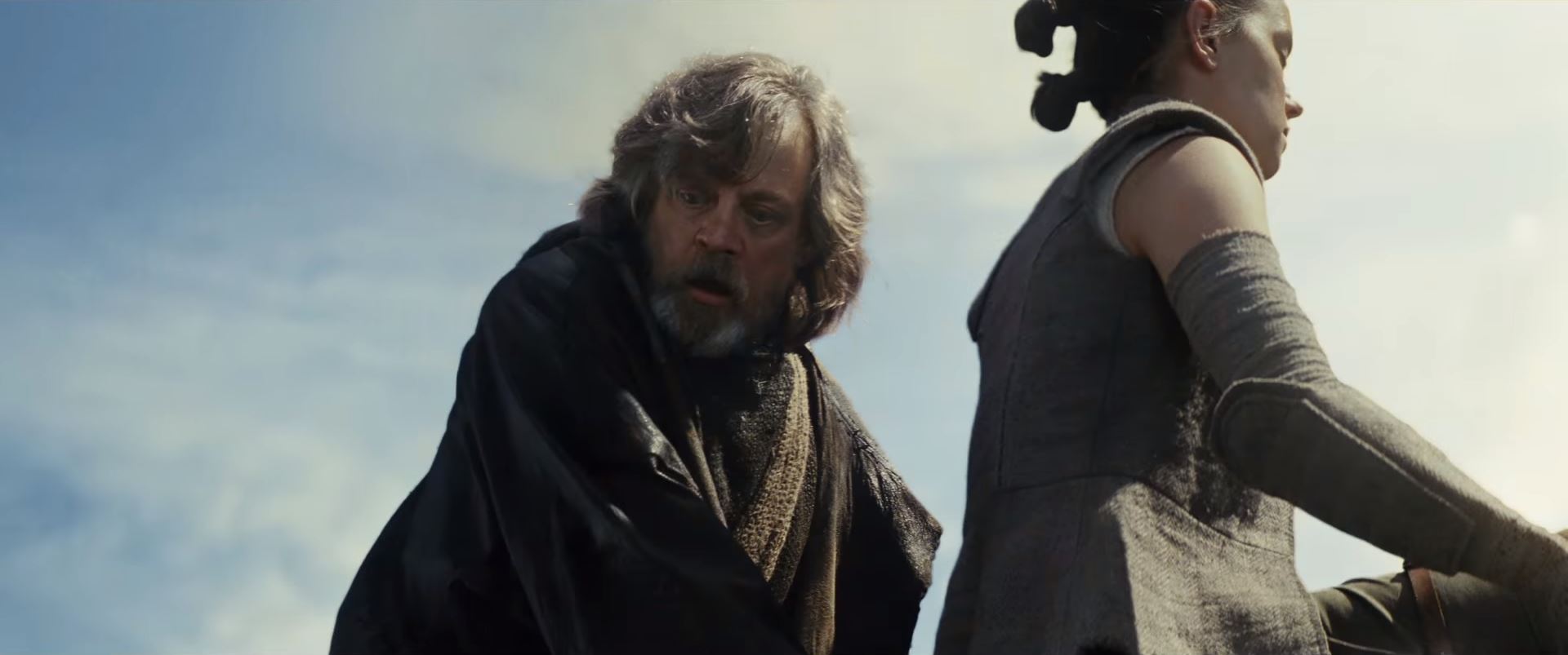 Luke warns someone that "this" is not going to go the way they think. Again, the editing would make the viewer think he's talking to Rey, but upon closer inspection, this appears to be the rainswept scene from The Force Awakens "Forceback" where the Knights of Ren attack.