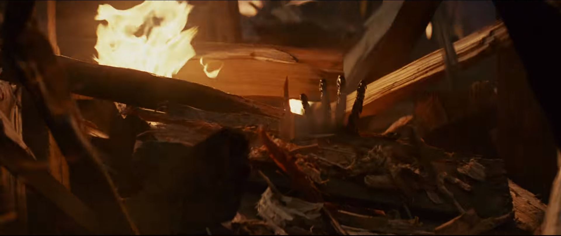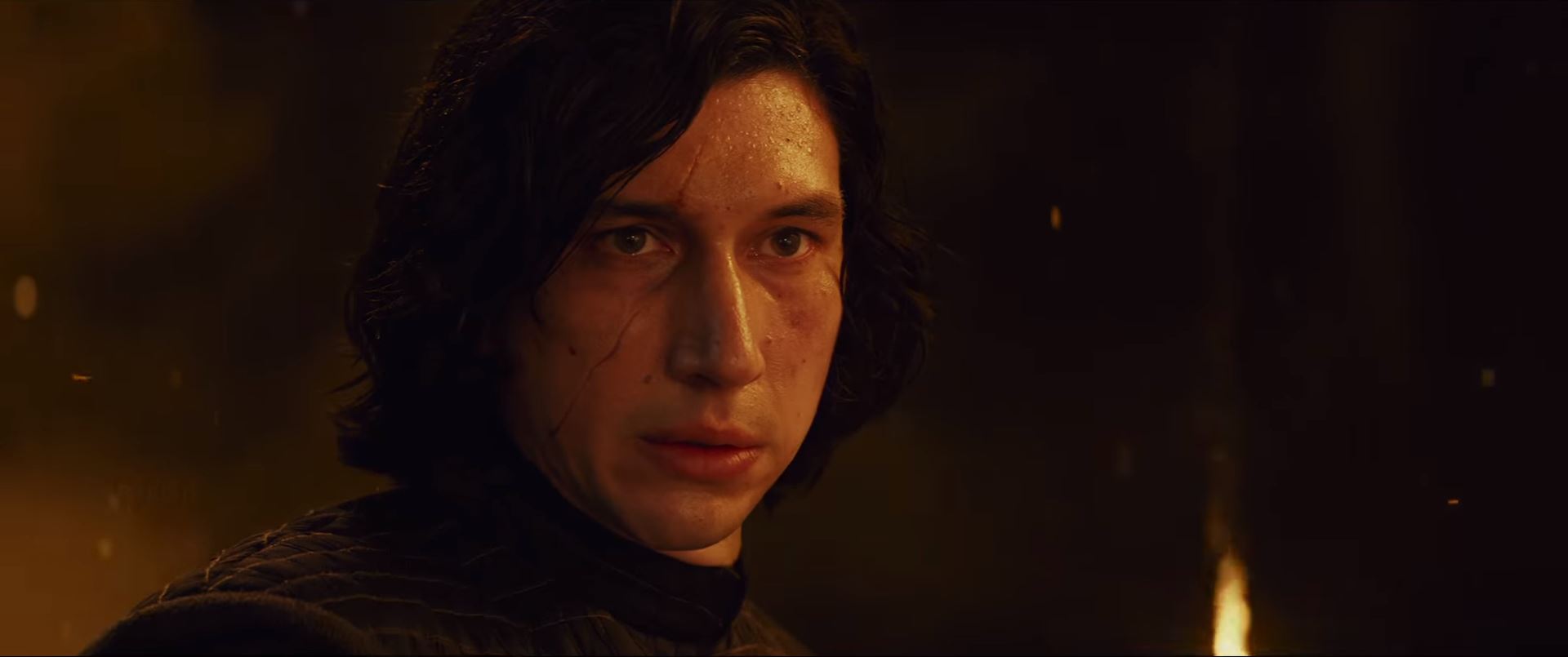 We immediately cut to a shot of Kylo Ren, but note this is a completely different environment with burning embers falling the background. This shot does not coincide with the previous shot of Rey. The fiery background might lead you to think this is from the scene of the burning temple, but notice Kylo's scar. This scene postdates the battle at the end of The Force Awakens.
